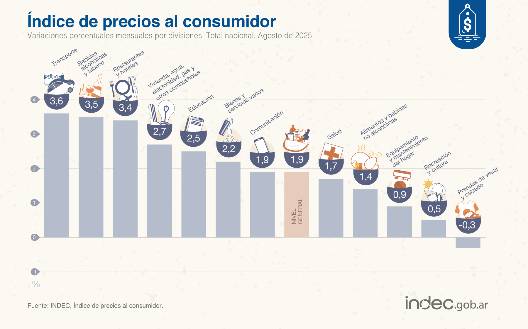 De acuerdo al informe de agosto, la división de mayor aumento en el mes fue Transporte (3,6%) por la suba en Adquisición de vehículos y en Combustibles, seguida de Bebidas alcohólicas y tabaco (3,5%), por incrementos en Tabaco.