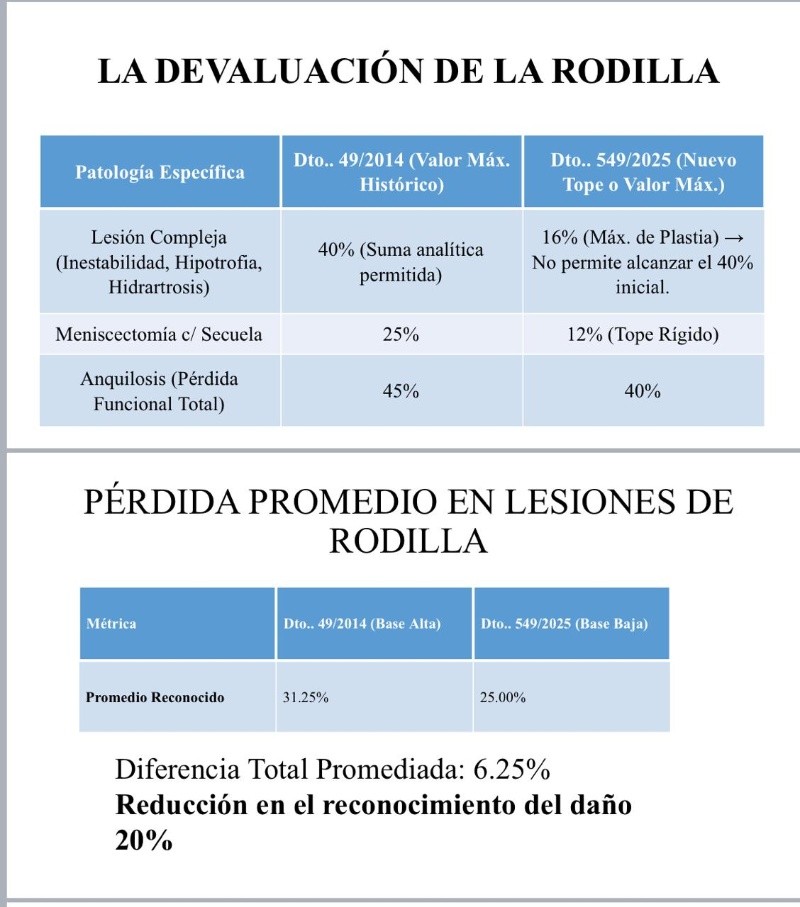Aparece acá el título de este “Run Run”, con la “devaluación de la rodilla”, ya que reduce el valor del daño en rodilla un 20%. Y no es de los peores casos. Por ejemplo, en las quemaduras de piel de tipo B (importante, pero no la más grave), el porcentaje de incapacidad bajó del 47% al 18%.