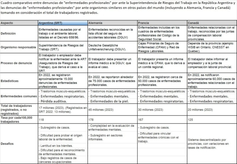 En efecto, un estudio comparativo de denuncias por “enfermedades laborales” con Francia, Alemania y Canadá arrojó que argentina es el que tiene la menor tasa: 118 por cada 100 mil trabajadores, contra los 125 de Canadá, 167 de Francia y 178 de Alemania.