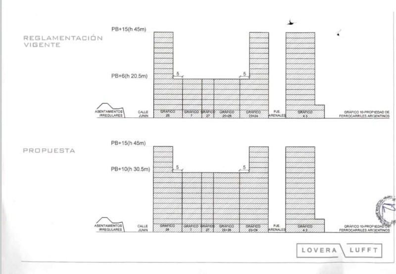 ¿Y los lotes al sur que van hacia Junin? Son intransferibles ya que no tiene posibilidades de tramitar su título más que a través de un juicio al estado. “Por lo cual la posibilidad de construir un edificio de perímetro libre ya no es posible”, admite. Y por eso el proyecto mutó a un complejo cerrado que cubre el predio con tres estructuras, dos de ellas que piden tener, entre medianeras, 30.5 metros de altura (Planta Baja más diez pisos) , por encima de los 19 metros habilitado para esa zona de calle Francia.