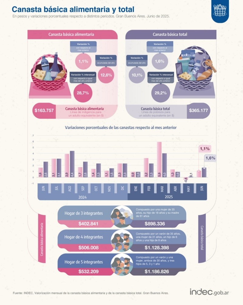 El Instituto Nacional de Estadística y Censos (Indec) informó este lunes que la inflación de junio fue de 1,6%, cifra que se ubicó apenas por encima de la variación del Índice de Precios al Consumidor (IPC) de mayo (1,5%). Además, el organismo estadístico precisó que la Canasta Básica Total (CBT) registró el mismo aumento que la inflación general durante el sexto mes del año, por lo que una familia de cuatro integrantes (dos adultos y dos niños) necesitó $1.128.398 para no ser pobre.