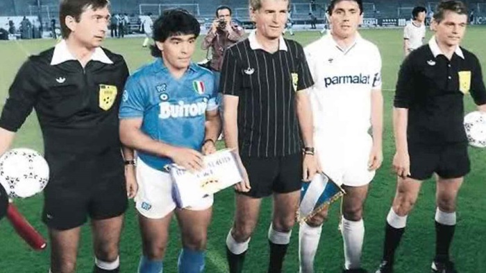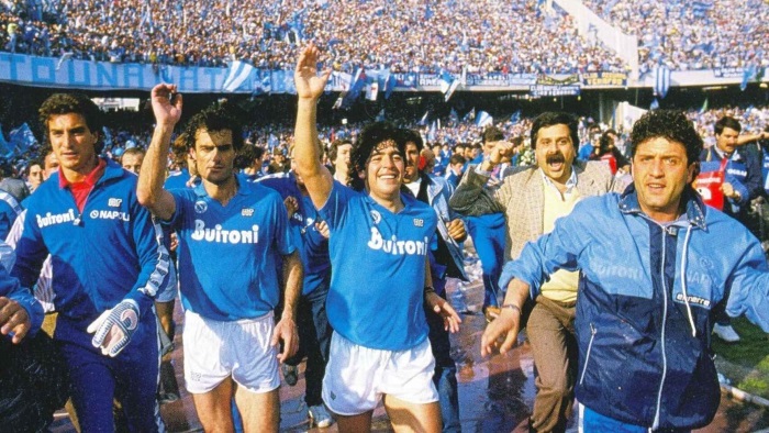 Diego Maradona vistiendo los colores del Nápoles.