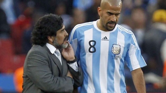 Juan Sebastián Verón y Maradona, en un partido de la albiceleste.