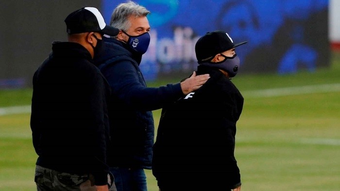 Diego Armando Maradona, acompañado por unos asistentes en el partido de Gimnasia.