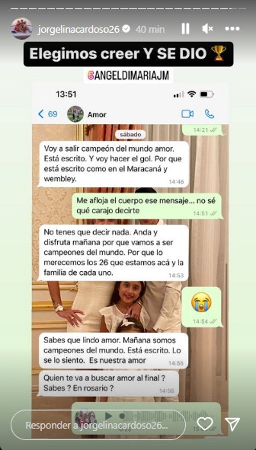 "Voy a salir campeón del mundo. Voy a hacer ese gol", le escribió Angel "Fideo" Di María a su mujer Jorgelina Cardoso en un mensaje de Whatsapp el sábado pasado, un día antes a la final del Mundial contra Francia.