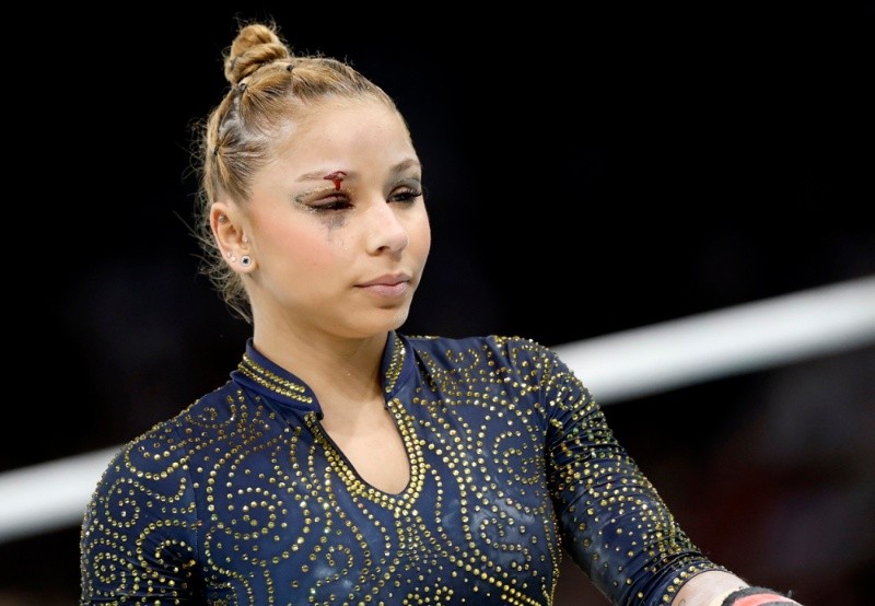 La gimnasta brasileña quedó desorientada tras el golpe y tuvo que ser atendida, reconoció que "no podía ver, sangraba. Dije: «chicos, ¿dónde estoy?». Me puse la mano en la cara y me sangraba el ojo, no entendía nada... El médico del equipo me dijo que todo estaba bien".