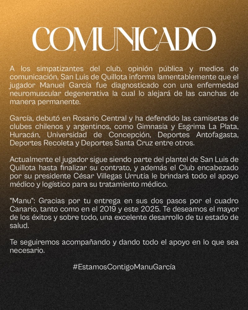 "A los simpatizantes del club, opinión pública y medios de comunicación, San Luis de Quillota informa lamentablemente que el jugador Manuel García fue diagnosticado con una enfermedad neuromuscular degenerativa, la cual lo alejará de las canchas de manera permanente", indicó la institución canaria, justo en la previa de su partido del pasado sábado ante la Universidad de Concepción, en el Bicentenario Lucio Fariña.