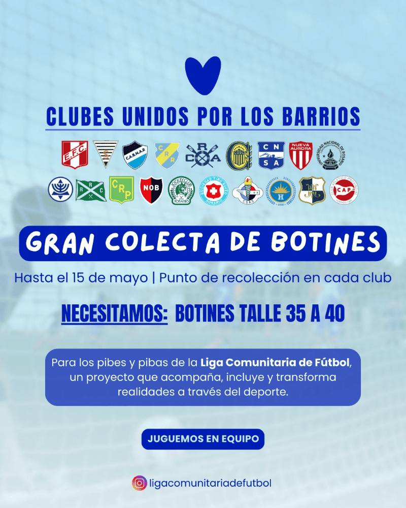 Los clubes de Rosario se unen por las escuelitas de barrio conformadas por la Liga Comunitaria de la ciudad. Es por eso que realizan una gran colecta de botines para aquellos niños y niñas no se queden fuera de la cancha por no tener el calzado adecuado.