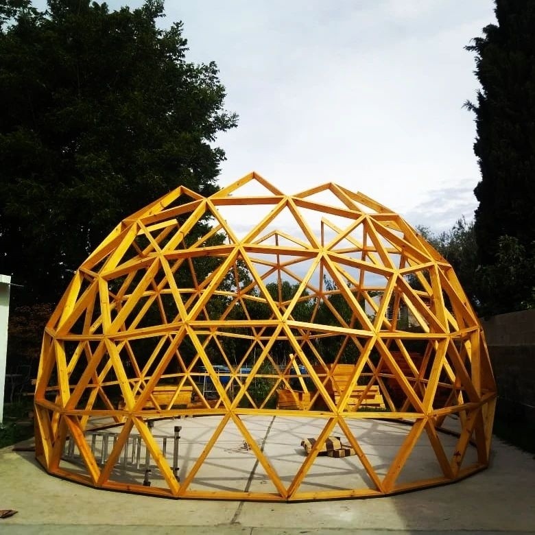 El domo geodésico es una semiesfera estructurada con triángulos. Estas cúpulas son muy funcionales, amigables con el medioambiente y se emplean para diversos usos. Debido a su forma, tienen una acústica particular, donde cualquier sonido se refleja creando una atmósfera singular. Además, permiten que el aire y la energía circulen sin obstáculos, ya que son cóncavos hacia abajo. Eso implica un ahorro de hasta de un 40% en energía para calefaccionarlos o enfriarlos.
