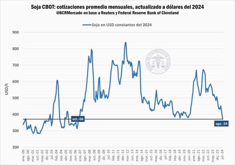 Para entender el impacto de este valor, es que si se corrige por la inflación en dólares el país norteamericano, el precio actual es el más bajo en casi 18 años: desde octubre de 2006, de acuerdo con un cálculo realizado por la Bolsa de Comercio de Rosario.