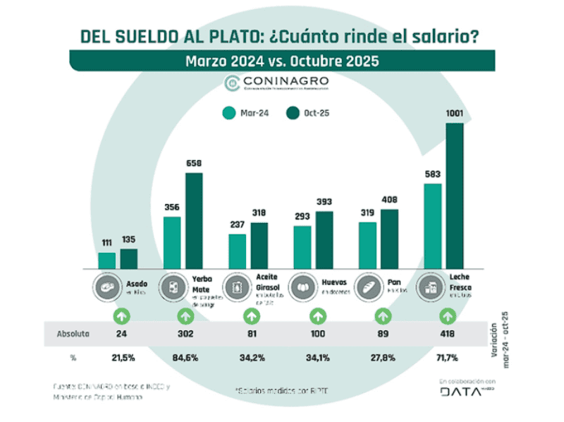 Otro caso destacado fue el de la leche, donde el poder de compra creció un 71,7%. Mientras en marzo de 2024 el ingreso promedio alcanzaba para 583 sachets de un litro, en octubre de 2025 esa cantidad ascendió a 1.001.