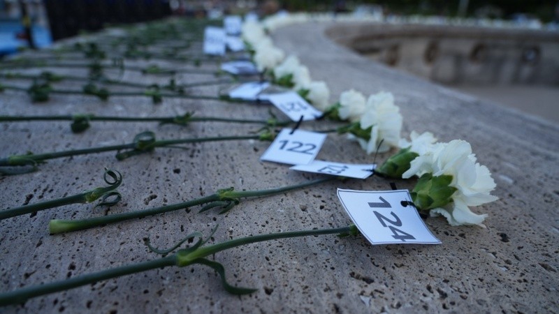 En la proa del Monumento a la Bandera hay 124 rosas blancas numeradas. Una por cada víctima confirmada del fentanilo contaminado usado en las terapias intensivas de distintos hospitales del país, sobre todo en las provincias de Santa Fe, Buenos Aires y Córdoba. Son las 18 del jueves y los primeros familiares se concentran. Llegan con fotos, carteles y velas que encenderán más tarde. Algunos se conocen. La mayoría se ve las caras por primera vez.