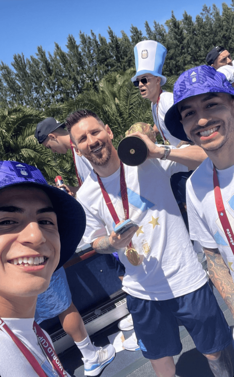 Mientras tanto, exhibiendo la Copa del Mundo, los jugadores y el director técnico Lionel Scaloni saludaban y cantaban a bordo de un micro descapotado con los miles de hinchas que se agolpaban por la autopista Riccheri, en medio de un amplio operativo de seguridad.