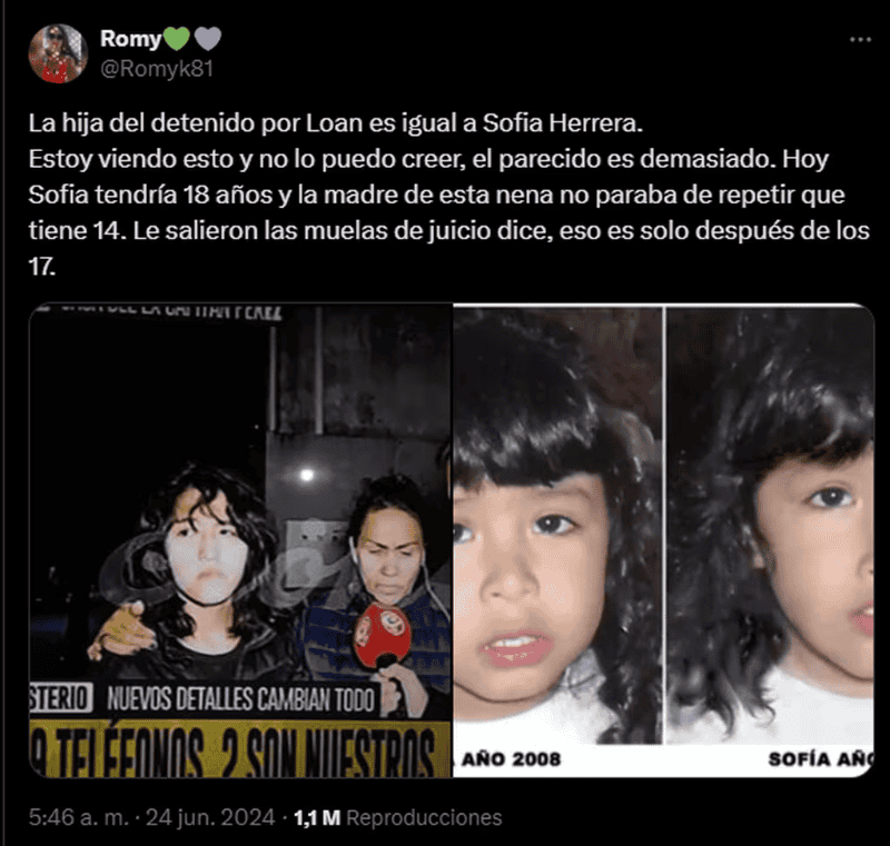 Uno de los usuarios comentó: “La hija del comisario detenido por Loan es igual a Sofía Herrera. El parecido es demasiado”. Sofía Herrera es una niña que desapareció en un camping cerca de Río Grande, Tierra del Fuego, el 28 de septiembre de 2008, y cuyo paradero sigue siendo un misterio.
