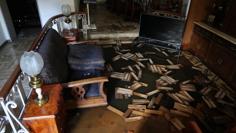 Producto de la fuga, un vecino que tiene su casa por calle Garay amaneció con parte del ingreso a su domicilio cubierto por el agua. "Cuando me levanté encontré en el living que tenía unos 20 cm de agua. Como tengo un desnivel, se acumuló toda acá y me levantó todo el parquet", contó indignado.