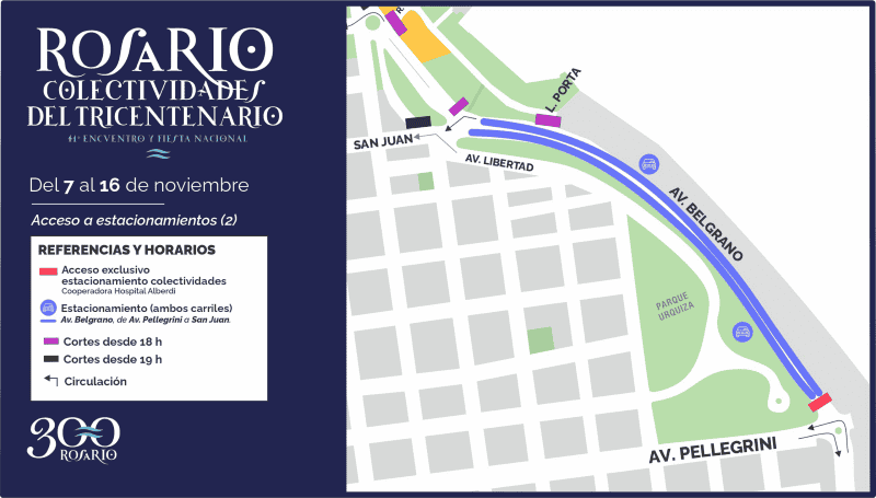 El esquema vehicular contempla cortes programados y una organización específica del estacionamiento. Para los vehículos particulares habrá dos sectores habilitados sobre avenida Belgrano: hacia el sur, desde San Juan hasta Pellegrini, y hacia el norte, desde el predio de Colectividades hasta la bajada Sargento Cabral, en el área de la ex Aduana.