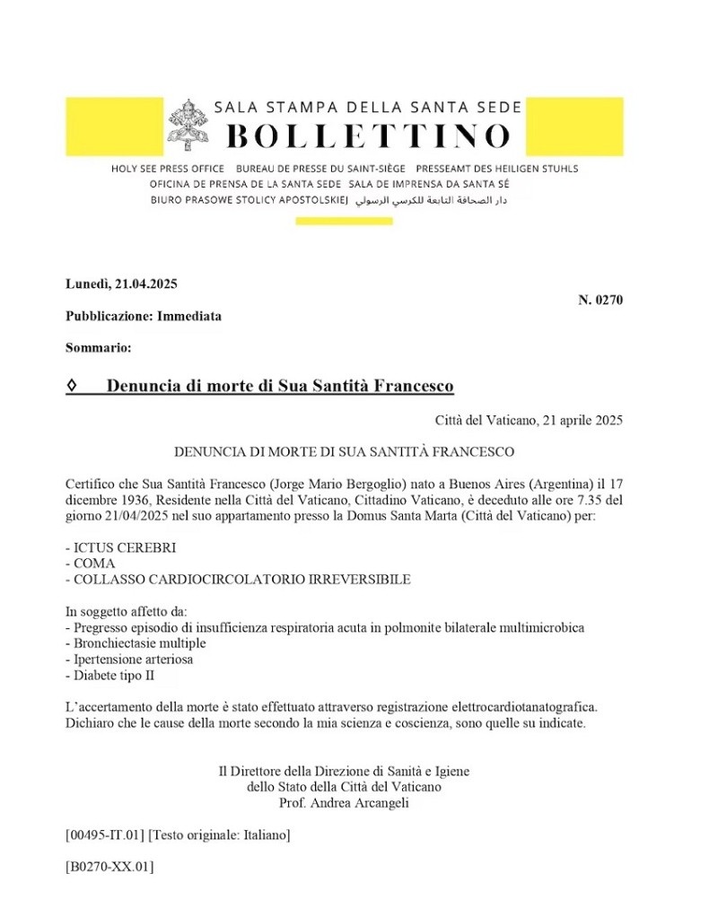 En el comunicado oficial dado a conocer desde el Vaticano se precisaba: “Certifico que Su Santidad Francisco (Jorge Mario Bergoglio) nacido en Buenos Aires (Argentina) el 17 de diciembre de 1936, residente en la Ciudad del Vaticano, Ciudadano del Vaticano, falleció a las 7.35 horas del día 21/04/2025 en su piso de la Domus Santa Marta (Ciudad del Vaticano) de: un derrame cerebral, coma y colapso cardiovascular irreversible”.