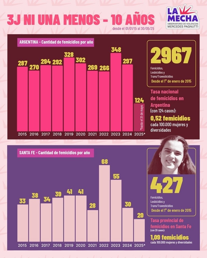 Solo en la provincia de Santa Fe, detectaron un total de 20 femicidios, de los cuales 11 fueron en la ciudad de Rosario, lo que representa el 55 % de los casos (ver apartado). Ante estos resultados, desde dicho observatorio rosarino destacaron que “esta violencia extrema no solo persiste: se reproduce de manera estructural en una sociedad marcada por la desigualdad, la impunidad y el abandono estatal”.