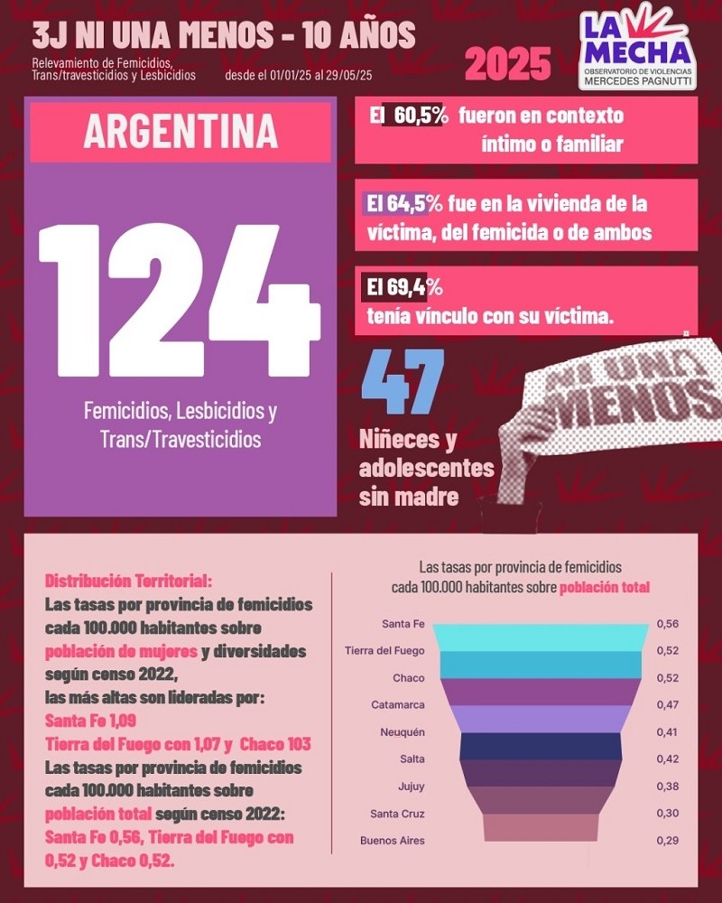 En el marco de la conmemoración de los 10 años del movimiento Ni Una Menos contra la violencia de género, en lo que va del 2025, el Observatorio de Violencias por Motivos de Género "Mercedes Pagnutti", que lidera la concejala Norma López, registró un total de 124 femicidios, lesbicidios y travesticidios en el país, a partir de su relevamiento de medios.