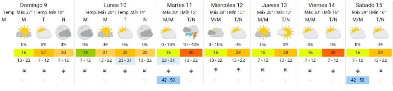 A partir del miércoles el viento cambiará al sur con leve descenso de la temperatura y ya sin anuncio de lluvias.