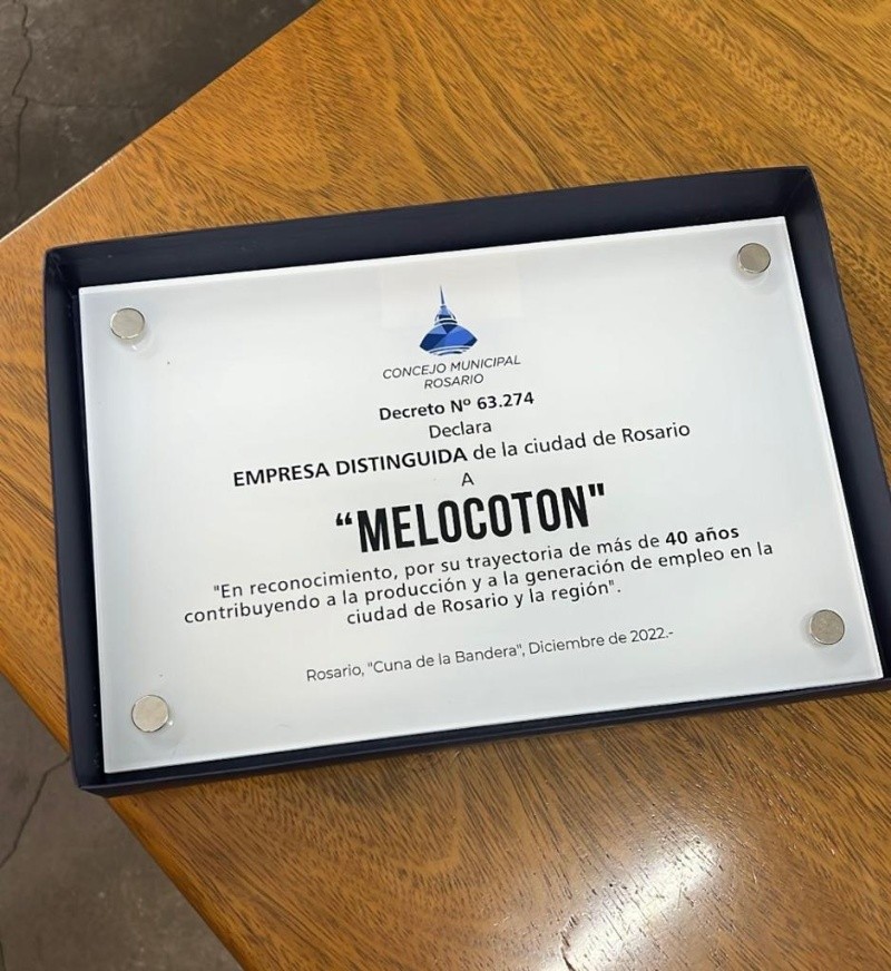 El Concejo de Rosario realizó esta semana el acto en el que se entregó el reconocimiento como Empresa Distinguida de Rosario a la firma “Melocotón”, a partir de una iniciativa del edil Marcelo Megna, de la Unión Cívica Radical, quien presidió el acto, junto a la edila Verónica Irizar, del bloque Socialista.