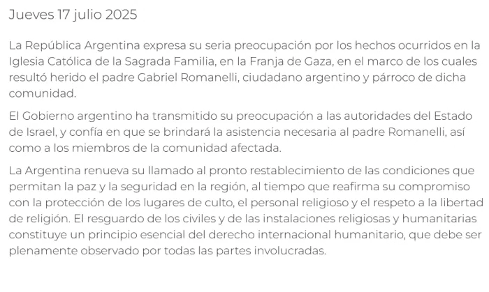 A través de un comunicado oficial, la Cancillería —encabezada por Gerardo Werthein— expresó: "La República Argentina manifiesta su seria preocupación por los hechos ocurridos en la Iglesia Católica de la Sagrada Familia, en Gaza, donde resultó herido el padre Gabriel Romanelli, ciudadano argentino y párroco de esa comunidad".