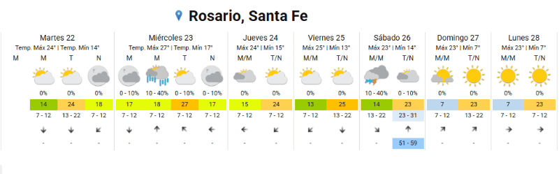 Este martes Rosario amaneció con el cielo despejado y una temperatura mínima de 14 grados. Según el Servicio Meteorológico Nacional, se espera un día templado en donde la temperatura máxima alcanzaría los 24 grados.