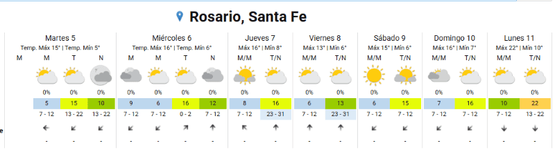Este martes Rosario amaneció bajo un cielo totalmente despejado, pero con una temperatura más fresca a comparación de los últimos días. El Servicio Meteorológico Nacional registró una temperatura mínima de 6 grados durante la mañana y se espera que la máxima alcance los 15 grados.