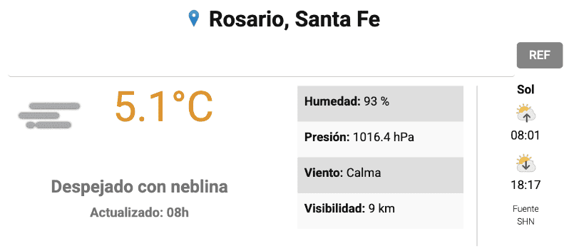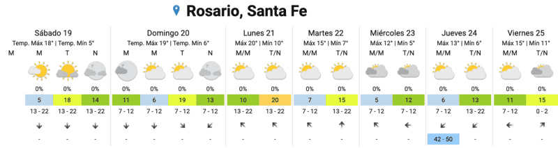 Rosario amaneció este sábado 19 de julio con cielo despejado, aunque con algunas nubes revoloteando. La máxima prevista para el día se ubica en los 18ºC y se espera que sea una jornada principalmente de sol, para disfrutar del aire libre, aunque con abrigo.