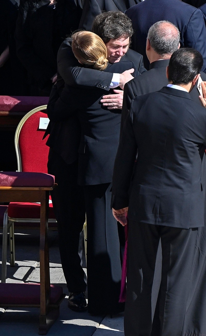 Milei arribó a la plaza minutos antes de que el féretro con los restos del papa argentino fuera sacado de la iglesia de San Pedro para el último adiós antes de su eterno descanso en la basílica de Santa María la Mayor.