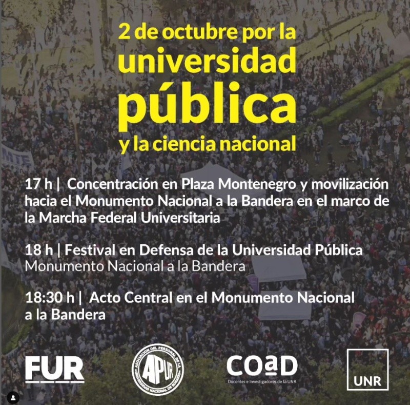 La marcha en defensa de la educación pública, la ciencia y la Universidad se desarrollará en todo el país el 2 de octubre y en Rosario ya se definió la modalidad: será una movilización que partirá desde la Plaza Montenegro para llegar al Monumento donde se desarrollará un festival y acto.