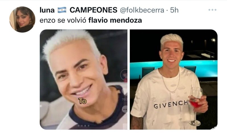 Enzo, hoy uno de los más codiciados por el mercado de pases europeo, compartió este último fin de semana con sus seguidores el cambio en su cabellera que se hizo tras consagrarse campeón del mundo. El futbolista se tiñó de rubio y los usuarios no tardaron en reaccionar.