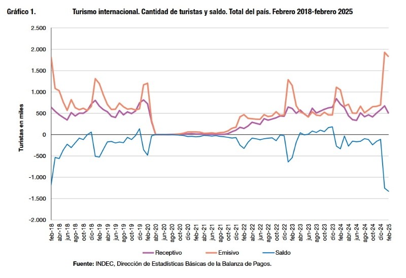 En el primer bimestre de 2025, ingresaron 1,2 millones de turistas internacionales a la Argentina por todas las vías de acceso (25% menos interanual) y salieron 3,8 millones (73,7% más) https://t.co/HP6Lh3B82G pic.twitter.com/IerBK0Uife