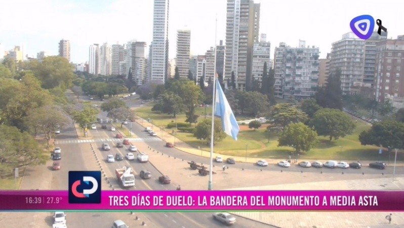 En la tarde de este tristísimo miércoles, el mástil mayor del Monumento a la Bandera mostraba a media asta la enseña nacional en señal de duelo por la pérdida del astro de fútbol argentino.