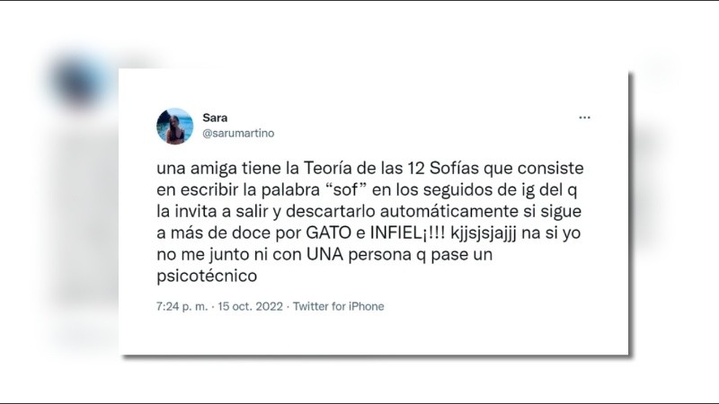 El tuit dice así: “Una amiga tiene la teoría de las doce Sofías que consiste en escribir la palabra «Sof» en los seguidos de Instagram del que la invita a salir y descartarlo automáticamente si sigue a más de doce por gato e infiel jaajajajaja!! Nah, si yo no me junto ni con una persona que pase un psicotécnico”.