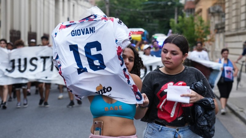 Trinidad, hermana de Giovani por el lado paterno (Desiré tiene otra pareja después de haberse separado de Vanesa hace años), levanta la camiseta de vóley charrúa del adolescente que falta. Ella hace con ese gesto que el grito de “Giovani presente” tome otra dimensión. A su lado, al frente de la bandera barredora, los compañeros de Central Córdoba. Están “Leonel” con el número 19 y “Salva” con la 2, entre otros.