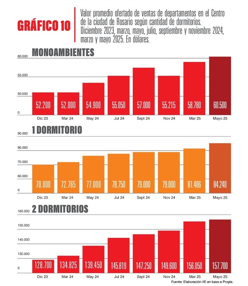 Por otro lado, en su Panorama Inmobiliario de Alquileres y Ventas correspondiente a mayo de este año, desde el Cocir detallaron los valores promedio de departamentos monoambiente y de uno y dos dormitorios en barrios seleccionados de Rosario. En el caso de los monoambientes, el valor promedio fue de USD 55.214, con las ofertas más costosas localizadas en Nuestra Sra. de Lourdes, Centro, Alberto Olmedo (Pichincha) y Abasto. Para el caso de los departamentos de un dormitorio, el valor promedio se situó en USD 78.119, con las opciones más caras en los mismos barrios que en el caso de los monoambientes. Finalmente, el valor promedio de los departamentos de dos dormitorios se ubicó en USD 143.500, ubicándose por encima de esa cifra las unidades de Pichincha, Centro y barrio Martin. El mayor incremento interanual en los valores de compraventa se registró en las unidades de dos dormitorios, cuya variación en dólares fue de 13,1% en mayo, agregaron. Luego siguieron los aumentos de monoambientes (10,2%) y departamentos de un dormitorio (9,4%).