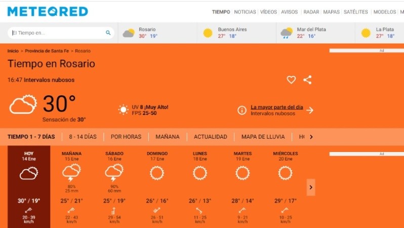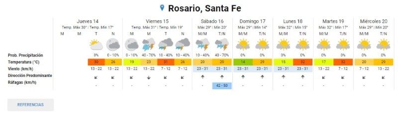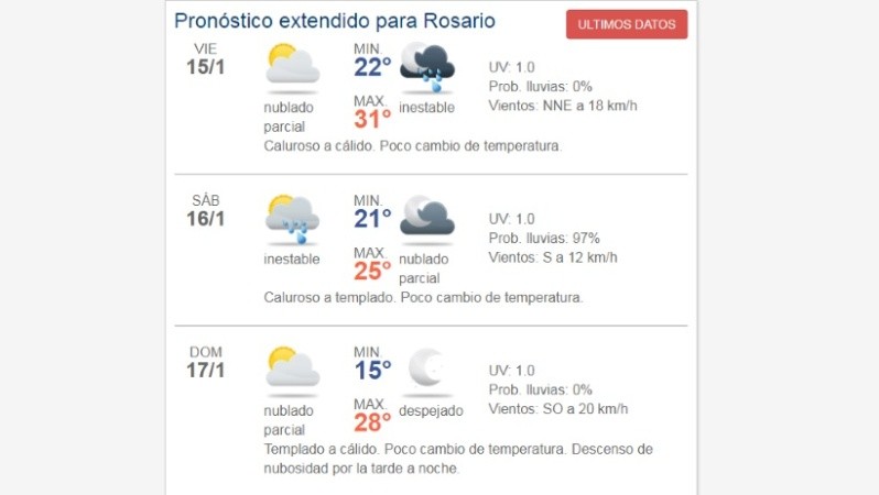 El sitio windguru, muy visitado y confiable en cuestiones del tiempo, coincide en que este viernes y sábado se darán precipitaciones sobre Rosario, aunque los valores acumulados no serán importantes. Y también indica que el domingo se despejarán las tormentas y saldrá el sol en la ciudad.