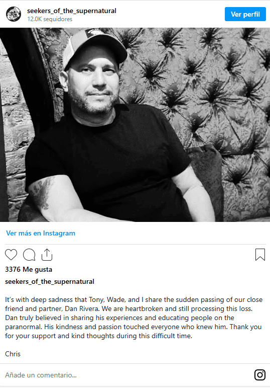 La noticia del fallecimiento de Rivera fue confirmada a través de un comunicado en la cuenta oficial de Instagram de NESPR. "Con profunda tristeza, Tony, Wade y yo compartimos el repentino fallecimiento de nuestro gran amigo y compañero, Dan Rivera. Estamos desconsolados y aún estamos procesando esta pérdida. Dan realmente creía en compartir sus experiencias y educar a la gente sobre lo paranormal. Su amabilidad y pasión conmovieron a todos los que lo conocieron. Gracias por su apoyo y cariño durante este momento difícil", expresaron.