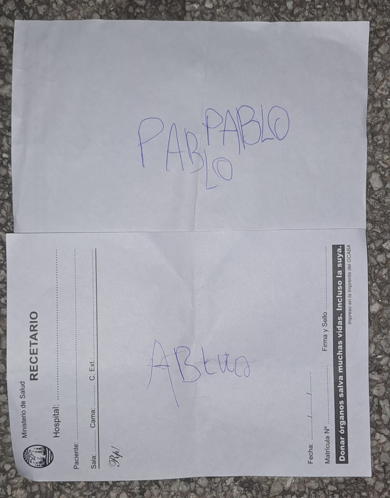 Este sábado, Pablo escribió su nombre dos veces y la palabra "Abuelo" o "Abuela" en un papel de un recetario médico.