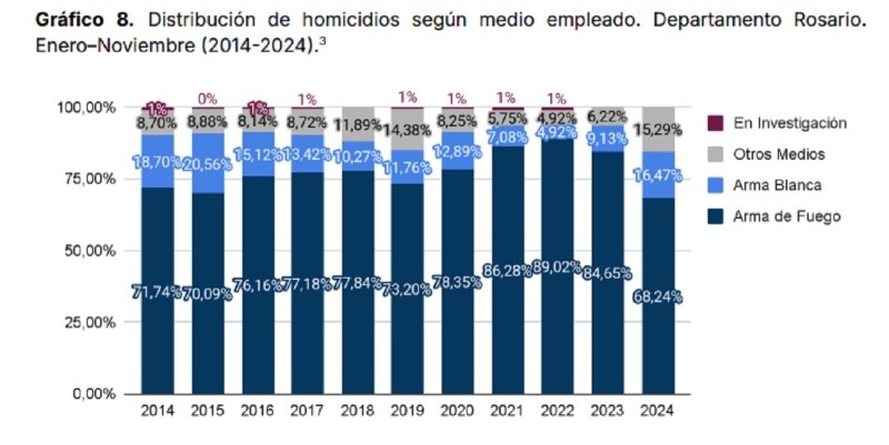 En la argumentación de las razones que lo llevaron a presentar el escrito, Caruana menciona una medida “transitoria y excepcional” adoptada en la ciudad de Santa Fe en octubre de 2014, cuando se suspendió por el lapso de 90 días la venta de municiones y armas, en un intento de contribuir a disminuir el clima de violencia en la región ante la ola de homicidios récord que se registró en esa época. También sostiene que los datos del Observatorio de Seguridad Pública (OSP) de Santa Fe, en el período de 2014 a 2021, muestran que en entre siete y nueve de cada diez homicidios cometidos en la provincia se utilizaron armas de fuego. “La eliminación de requisitos para venta, tenencia y portación de armas” aduce una “libertad que resulta engañosa por diversas razones, ya que una vez que el número de armas en la sociedad crece, los riesgos que se derivan son para todos”, explica. “Aún quienes ejercen su libertad de no tener armas sufren las consecuencias violentas de que más personas estén armadas y la experiencia demuestra que estas consecuencias impactan en las calles, en las escuelas y en los hogares”, evalúa. El impacto de una mayor circulación de armas legales en mayores facilidades para el crecimiento del mercado ilegal es otro de los argumentos del proyecto, anclado en el caso de Brasil, donde a partir de la flexibilización de las condiciones de acceso para las personas, el resultado fue un “crecimiento exponencial de la cantidad de armas en manos de la población, a través de redes de tráfico en las que se recluta a personas (en su mayoría pobres), se les gestiona la licencia para el uso legal, corriendo con los gastos de esos trámites y de la compra del armamento, y luego de denunciar un falso robo del arma, se las desvía hacia el mercado negro”. El extitular de la cartera de salud municipal expuso además que el aumento de la cantidad de armas en circulación multiplica los riegos a los que están expuestos los adolescentes. “Está relevado –explica– que los que cuentan con fácil acceso a armas tienen tasas de suicidio más altas que los que no viven en hogares con armas, en tanto los riesgos de disparos involuntarios y de violencia escolar y comunitaria se incrementan con el acceso a las armas de fuego en el hogar”. El texto quiere establecer la prohibición en todo el ámbito territorial de la jurisdicción municipal de Rosario la comercialización de armas de fuego a menores de 21 años. Para eso, propone modificar el artículo 4 de la ordenanza N° 8761 para que el Ejecutivo local instrumente un sistema informático de uso obligatorio para las personas, locales y lugares vinculados al comercio legal de armas de fuego. Establece que deben registrarse los datos personales del vendedor y comprador: nombre y apellido o razón social, domicilio, documento de identidad, C.U.I.T., edad (mayor de 21 años), datos del legajo de usuario según el manual registral y/o de la Tarjeta de Control de Consumo de Municiones, según corresponda. También sobre armas, municiones y materiales controlados: marca, tipo, calibre y número de serie correspondientes. Y las operaciones: fecha, tipo y número de comprobante y cantidad. Los tipos de operaciones se consideran: compra, venta, importación, exportación, devolución, recarga, reparación, montaje, entre otras. El sistema informático será independiente de los controles, fiscalizaciones y registros dispuestos por las autoridades nacionales y/o provinciales. La carga de cada operación deberá efectuarse de manera inmediata a su realización por los propios sujetos mencionados en el primer párrafo, mediante formulario del sistema informático". En caso de incumplimiento de lo dispuesto, propone que se apliquen las sanciones dispuestas en el artículo 204 del Código de Convivencia Municipal “por incumplimiento de la normativa vigente en la habilitación de armerías”. ¿Qué implicancia tienen las armas de fuego en los episodios con heridos y homicidios en Santa Fe? Según el último reporte del OSP, durante los once meses transcurridos de 2024 se contabilizaron 161 víctimas de homicidios en la provincia de Santa Fe; 85 en el departamento Rosario y 32 en el departamento La Capital. Se trata de una disminución de la cantidad de homicidios del 55,5% a nivel provincial, del 64,7% en el departamento Rosario y del 52,9% en La Capital con respecto a igual período del año anterior. El número de homicidios cometidos por armas de fuego en la provincia de Santa Fe, en el departamento Rosario y en el departamento La Capital posee los registros más bajos de toda la serie temporal analizada 2014/2024. Se trata de una disminución del 66,9% en el caso de la provincia, 71,6% en el departamento Rosario y del 64,8% en La Capital contra el mismo periodo del año 2023. En los primeros once meses de 2023, casi ocho de cada diez muertes se produjeron por el uso de armas de fuego, mientras que en 2024 representan a cerca de seis de cada diez. Se trata de la presencia relativa del fenómeno más baja de toda la serie temporal. En la última década, el porcentaje más elevado de las muertes producidas por el usar de armas de fuego fue 2022, con el 81,62%. Por su parte, en el departamento Rosario la proporción de muertes cometidas con armas de fuego entre enero y noviembre de 2024 es la más baja de toda la serie temporal. La presente distribución permite mostrar cómo el fenómeno de la violencia ha cambiado su composición este año respecto de los anteriores: la modalidad de arma de fuego es la más importante, pero al disminuir ésta, ha aumentado la prevalencia de casos de armas blancas y de otros medios en relación al resto, alcanzando los porcentajes más altos desde 2016. En cuanto a los heridos por arma de fuego, el reporte del OSP muestra que durante los primeros once meses de 2024 se registraron 750 personas heridas en la provincia de Santa Fe. Se trata de la cifra más baja para el intervalo ene