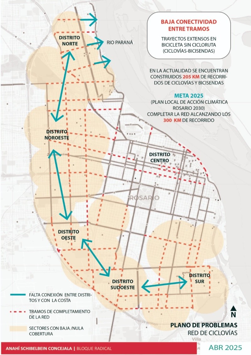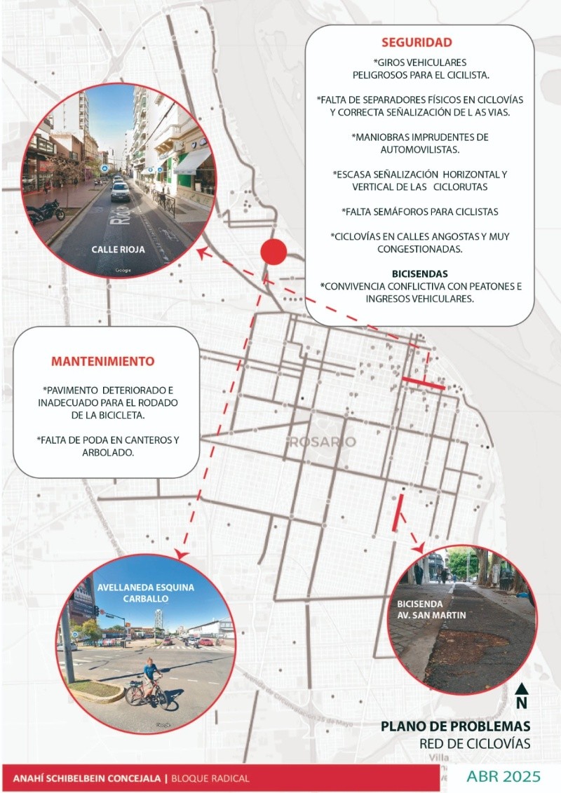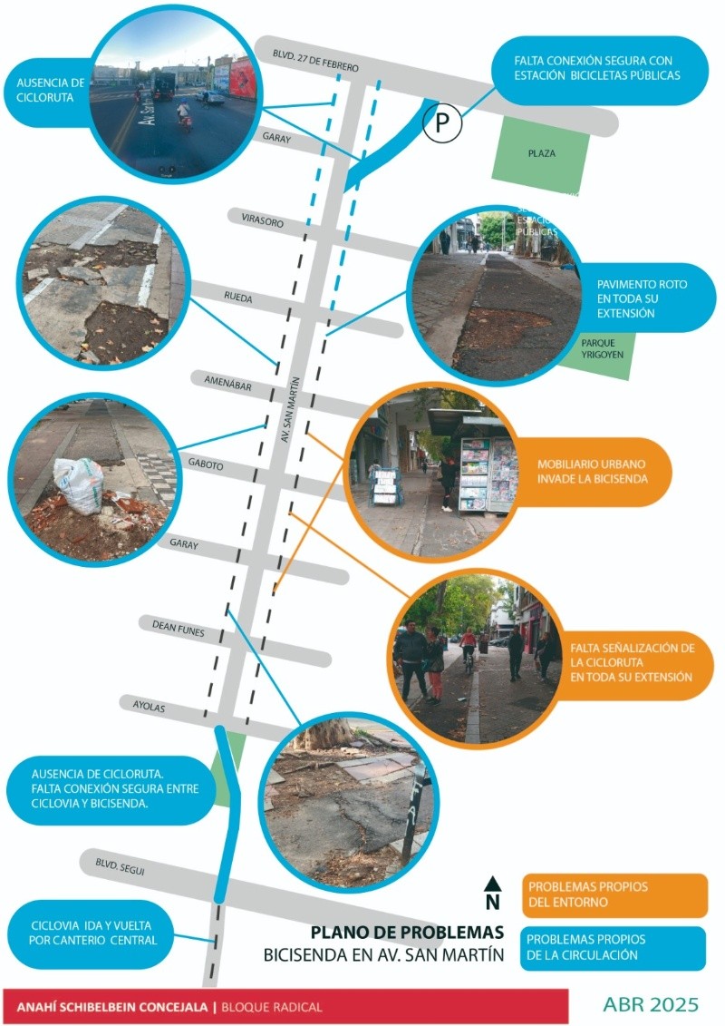 Un ejemplo de eso es el trayecto de ciclovía que hay sobre avenida San Martín. La misma nace en zona sur, en calle Arijón, y se interrumpe en su intersección con bulevar Seguí. “Esta interrupción presenta un alto riesgo para los ciclistas que transitan por San Martín porque al atravesar Seguí se ven obligados a transitar alrededor de 300 metros por una avenida sin ciclovía. En dicho tramo deben cruzar la calzada para transitar por la derecha o para empalmar con la bicisenda a la altura de Ayolas”, detalló.