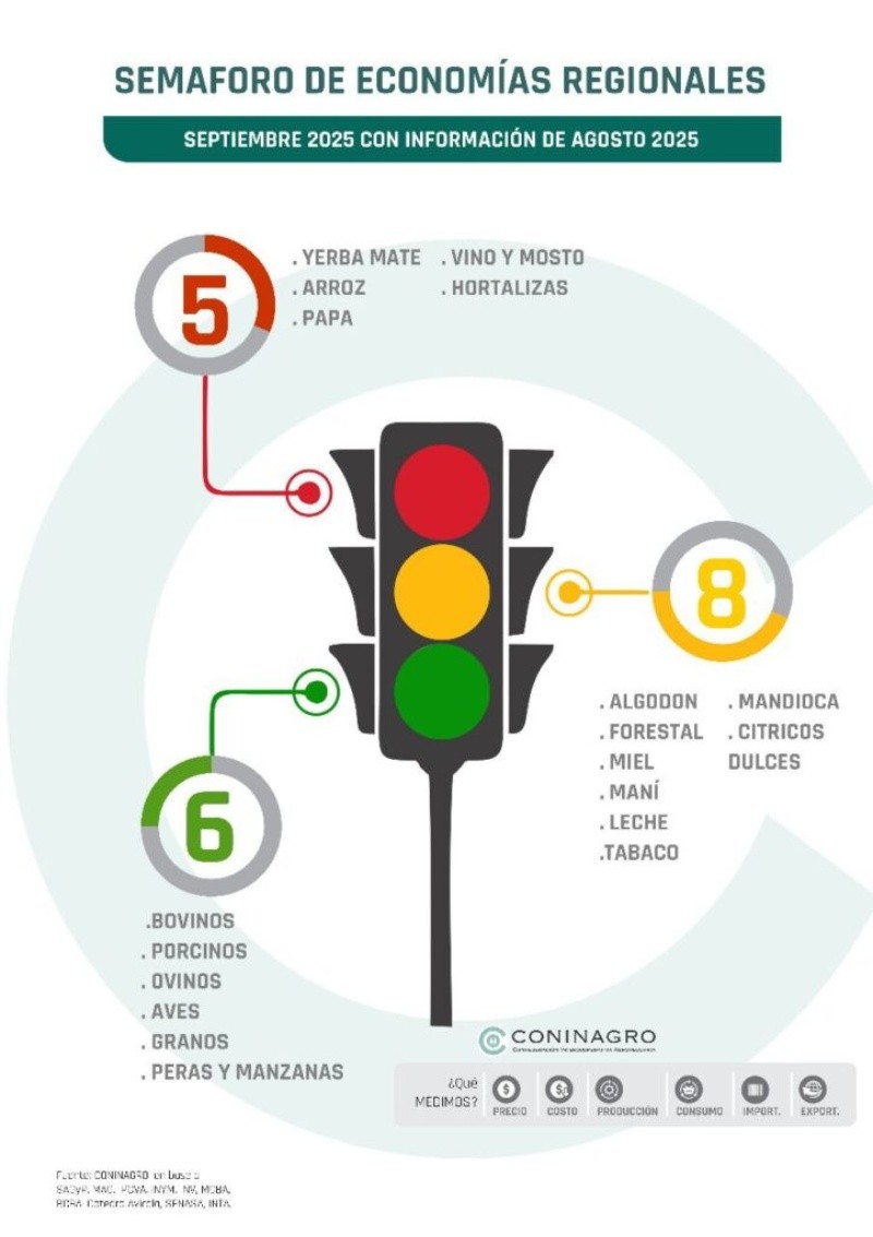 Lo valioso de la información de Coninagro también radica en el formato en que la presenta: a través de un semáforo, buscando simplificar la complejidad y heterogeneidad de los números de la producción del campo con una herramienta visual que permita una mejor comprensión. Por lo tanto, en rojo figuran las economías regionales en problemas; en amarillo las que dan indicios de complicaciones futuras o no alcanzan el desarrollo posible; y en verde las que van viento en popa, con contextos venturosos y cifras a favor.
