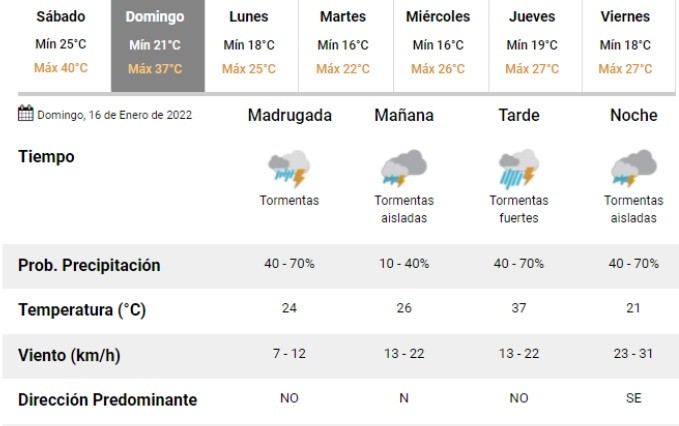 El ranking de temperaturas elaborado a las 15 por el SMN era encabezado, con 43º por la ciudad de La Rioja. Le seguían: Santiago del Estero (41.8º), Termas del Río Hondo (41.7º), 9 de Julio (40.8º), Córdoba (40.2º) y Pilar (Córdoba, 40º).
