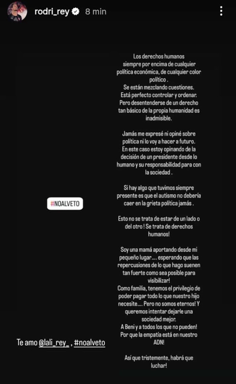 “Jamás me expresé ni opiné sobre política ni lo voy a hacer a futuro. En este caso estoy opinando de la decisión de un presidente desde lo humano y su responsabilidad con la sociedad. Si hay algo que tuvimos siempre presente, es que el autismo no debería caer en la grieta política, jamás”, siguió.