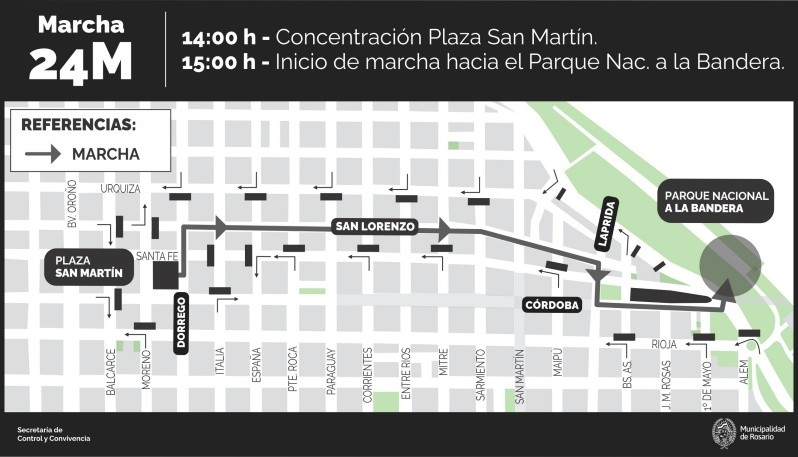 Voceros de Control municipal precisaron a Rosario3 que hay un acompañamiento de agentes de Tránsito a medida que avanza la marcha, para garantizar su desplazamiento sin inconvenientes. Y cabe recordar que además se hizo como cada año, la Vigilia del sábado 23 en la plaza 25 de Mayo para acompañar a Abuelas de Plaza de Mayo desde las 18 hasta la medianoche, con música y films.