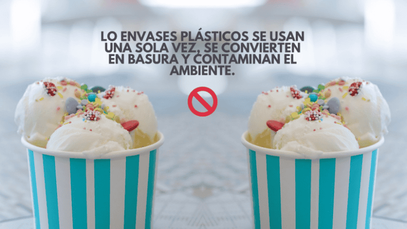 Cacciabue aclaró que no se elimina totalmente ya que se seguirán utilizando los envases actuales en potés de un kilo para delivery, bandejas y copas pero que se reemplaza el plástico en el expendio al por menor en el mostrador.