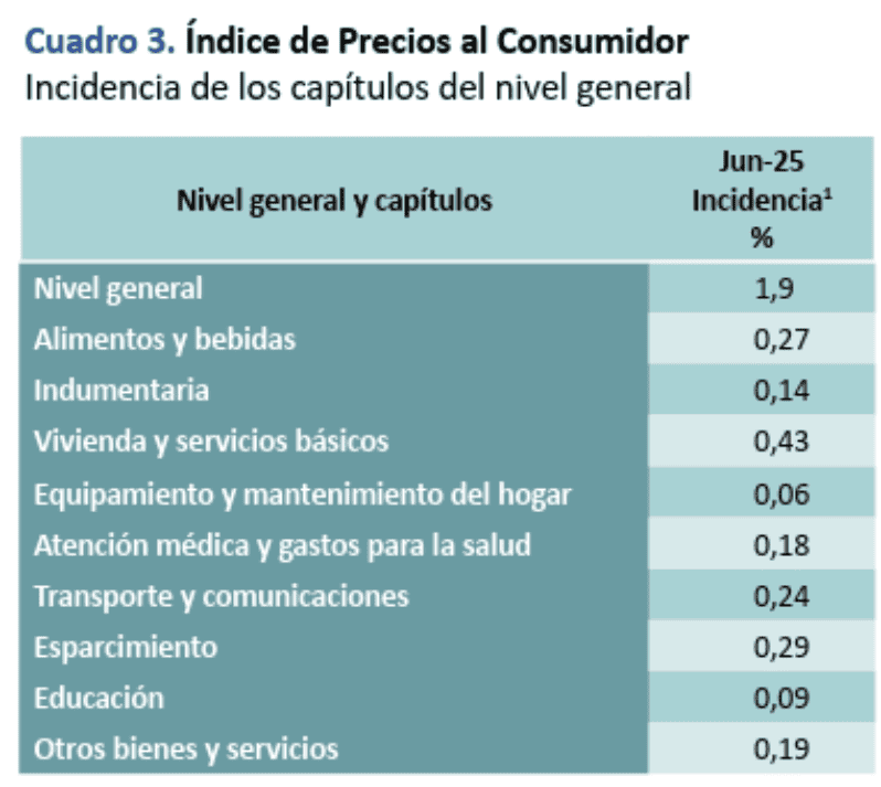 Los rubros que impulsaron el alza fueron “Vivienda y servicios básicos” y “Esparcimiento”, con subas del 4,2% y 4,1%, respectivamente. Estos sectores también fueron los de mayor incidencia sobre el índice general, aportando 0,43 y 0,29 puntos porcentuales del total provincial.