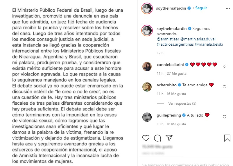 "El Ministerio Público Federal de Brasil, luego de una investigación, promovió una denuncia en ese país que fue admitida, un juez fijó fecha de audiencia para recibir la prueba y resolver sobre los hechos del caso", escribió Thelma en una suerte de comunicado publicado en Instagram y Twitter