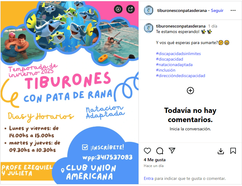 "Tiburones con patas de rana", se trata de un proyecto rosarino en el que dos profesores de educación física se lanzaron a tener un "espacio propio, donde el límite no exista". Julieta y Ezequiel son los encargados de llevar a cabo las clases de natación para personas con discapacidad.